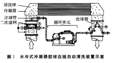 水冷式冷凝器膠球在線自動清洗原理