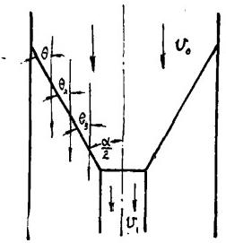 (1)進(jìn)入下方箱的中心部分流體(以下簡稱中心部分流體)既不加速也不減速,其余部分流體亦不發(fā)生變化。對于無粘性流體,此時(shí)V?=V。。在這種情況下流線不發(fā)生任何變化:仍為平行直流線。各處流線與收球網(wǎng)板的夾角均相等,等于網(wǎng)板與中心線的夾角(圖2),即式中α為收球網(wǎng)板的設(shè)計(jì)夾角。