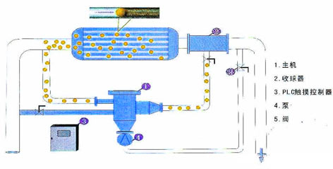 將收球網操作手輪旋至“收球位置,膠球泵進口閥打開,啟動膠球泵,打開裝球室出口閥 將裝球室切換閥打至“清洗位置”清洗系統30分鐘。