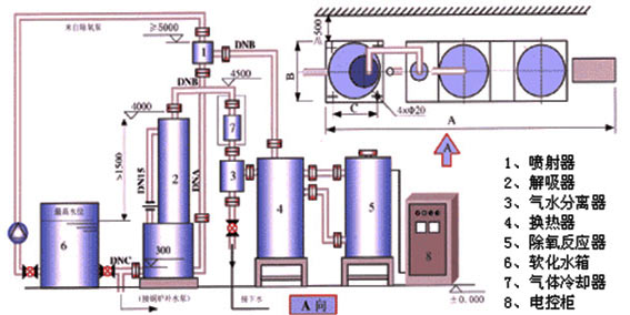 12、解析除氧器應與水箱在同一水平面上,特殊情況應提前說明,設備在安裝布置時,應保證布置主要尺寸中A值和C值的要求,考慮B值時應當盡量使設備安裝緊湊。