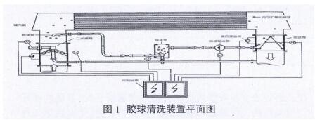 凝汽器膠球清洗裝置主要由收球網、膠球輸送泵、裝球室、程控裝置等設備組成。它借助水流的作用,將大于凝汽器冷卻管內徑的海綿橡膠球擠過冷卻管,對冷卻管進行反復循環擦洗。采用膠球清洗裝置(如圖1所示)可在機組不停機、不減負荷的情況下清洗凝汽器冷卻管內污垢,降低凝汽器端差,提高凝汽器真空度和汽輪機熱效率。