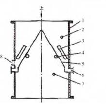 圖4改造后的A形雙箭式收球網(wǎng)縱剖面結(jié)構(gòu)注:1捕環(huán)水管管壁;2網(wǎng)前測(cè)壓點(diǎn);3導(dǎo)流.板.;4軸;5網(wǎng)板;6脫球引出管;7網(wǎng)后測(cè)驗(yàn)點(diǎn);8觀寨孔
