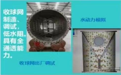 ②收球網(wǎng)網(wǎng)板結(jié)構(gòu)設(shè)計通流能力較低,運行中收球網(wǎng)前后壓差過大導(dǎo)致膠球被擠壓在收球網(wǎng)的網(wǎng)板表面而堵塞流體通道。特別是在蝸牛或海生物或碎片垃圾影響下,通流能力顯著降低,導(dǎo)致網(wǎng)板前后有明顯的壓球。因此要求運行中收球網(wǎng)運行壓差+300mm水柱。